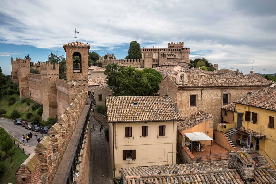 Al confine tra Marche ed Emilia Romagna, il rosso Castello di Gradara domina lo splendido borgo medievale di Gradara, posto su una collina vista mare e protetto da una doppia cinta muraria.