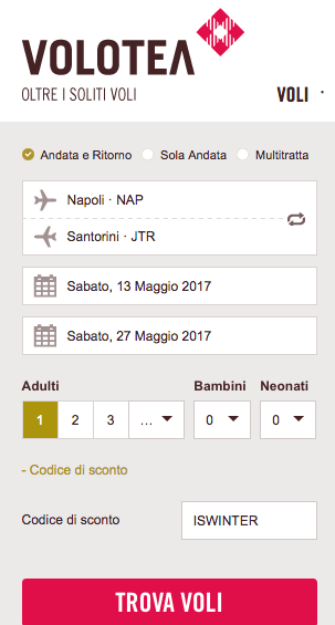 Occhio però che se sei socio Super Volotea lo sconto per te sarà di soli € 5 a tratta.