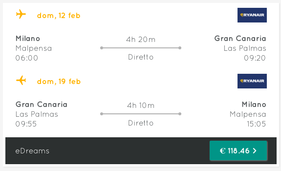 Ci sono anche questi Ryanair con partenza da Milano Malpensa a Gran Canaria, con andata il 12 febbraio e il ritorno il 19 dello stesso mese a € 118,46 – qui trovate l’offerta –