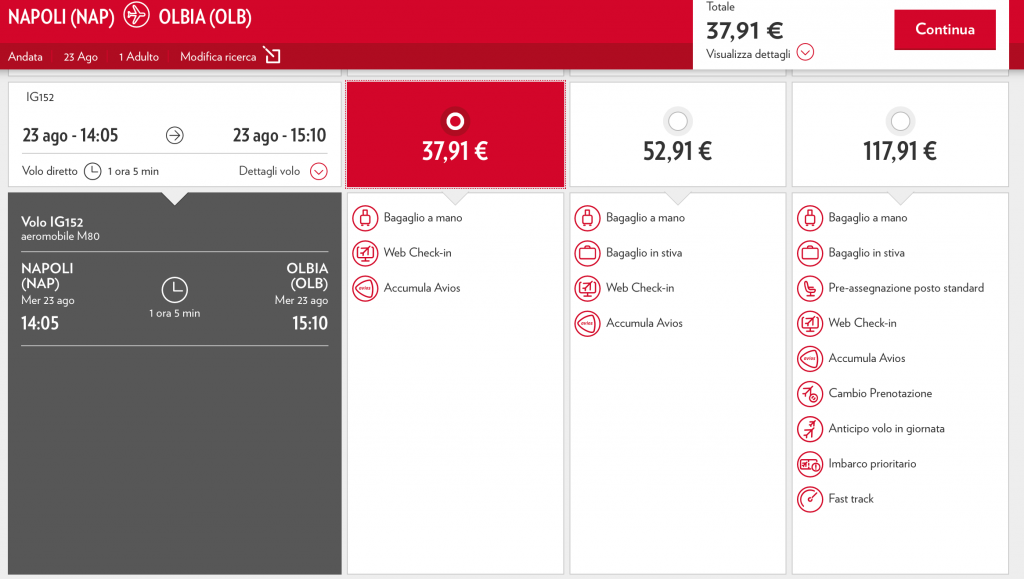 o questo da Napoli a Olbia a € 37,91 sempre per il mese di agosto.